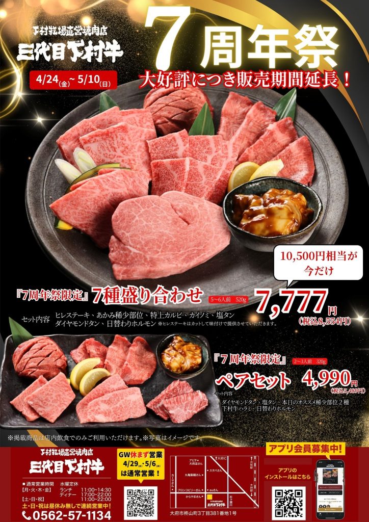 「下村牧場直営焼肉店三代目下村牛」は、おかげさまで開店7周年を迎えます。日頃のご愛顧に感謝を込め、豪華限定メニューを特別価格で提供する「7周年祭第1弾」を開催いたします。