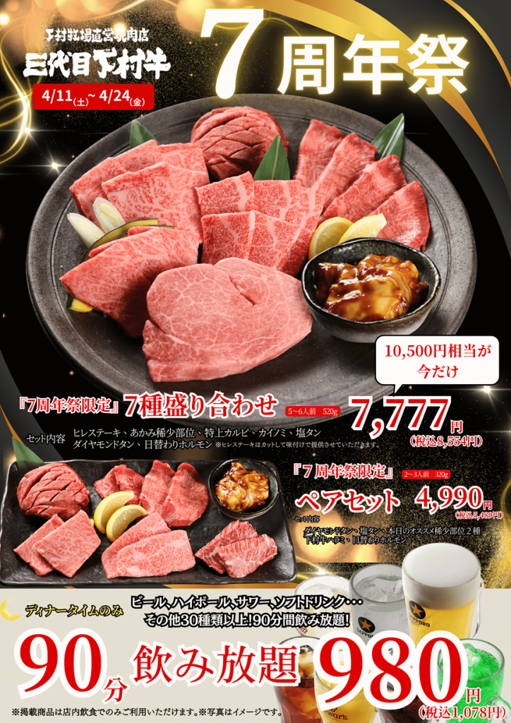 「下村牧場直営焼肉店三代目下村牛」は、おかげさまで開店7周年を迎えます。日頃のご愛顧に感謝を込め、2026年4月11日(土)から4月24日(金)までの14日間、豪華限定メニューを特別価格で提供する「7周年祭第1弾」を開催いたします。